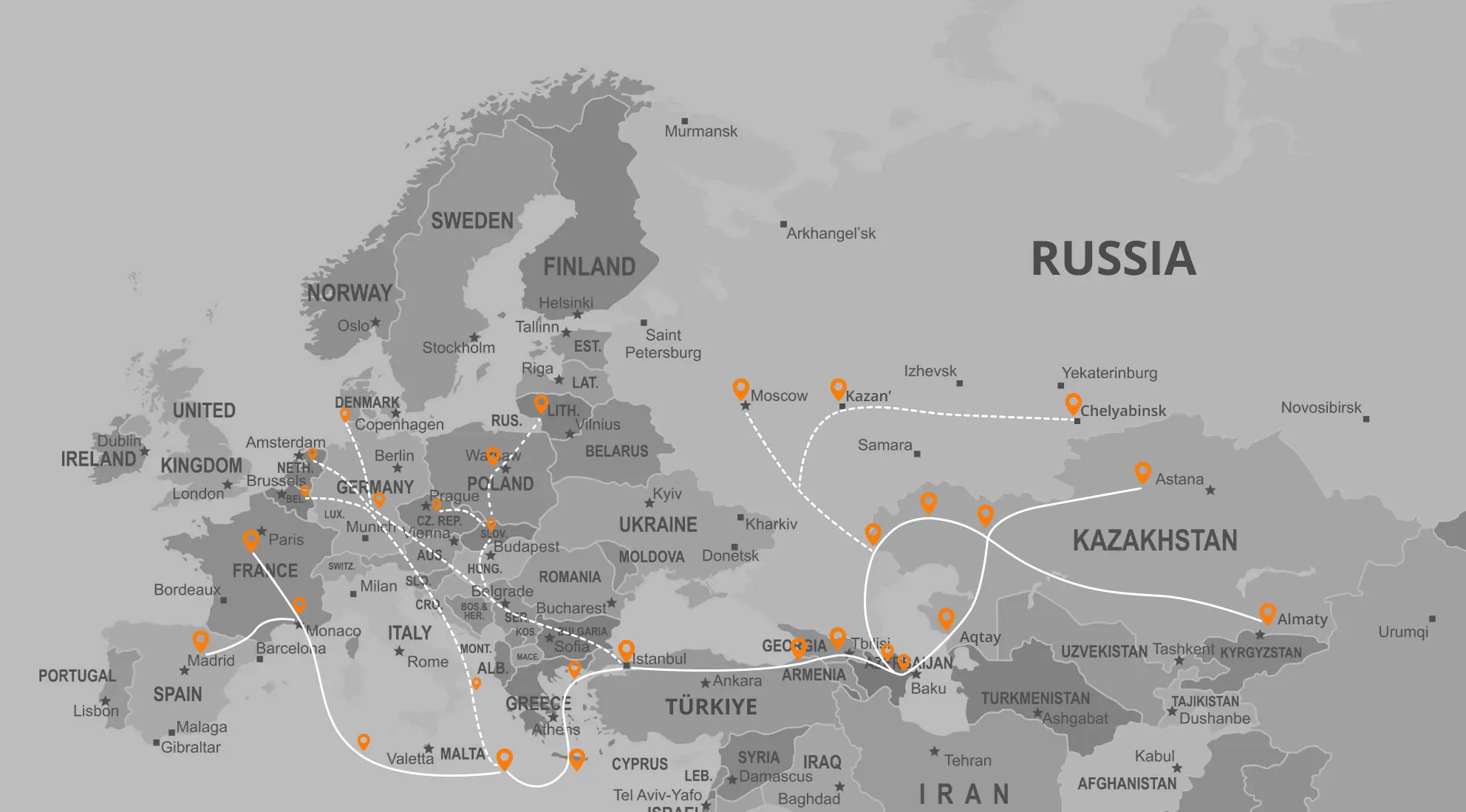 Біздің мамандануымыз — халықаралық құрлықтық автокөлік тасымалдары мына бағыттар бойынша: